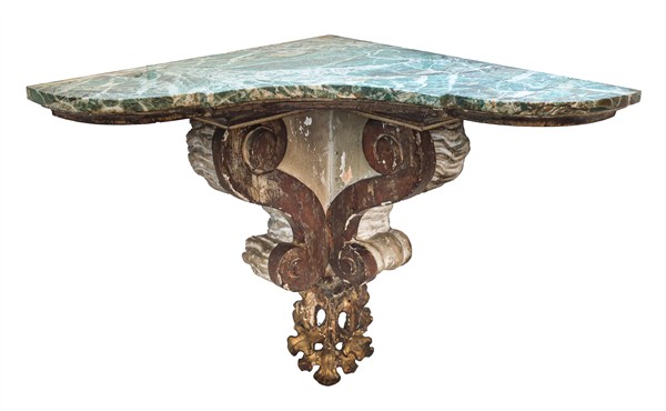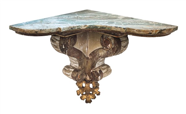 Coppia di mensole angolari in legno intagliato, laccato e dorato con sostegni a voluta e motivi a foglia, piano sagomato in marmo (cm 55x60x55) (difetti e restauri)
