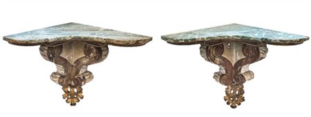 Coppia di mensole angolari in legno intagliato, laccato e dorato con sostegni a