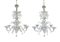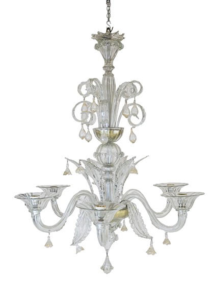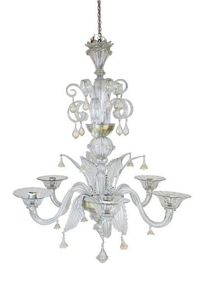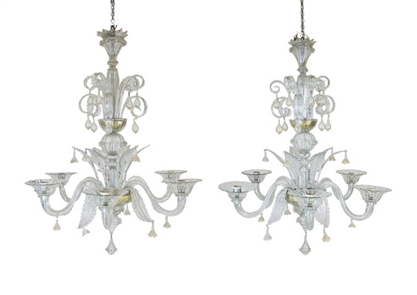 Manifattura di Murano. Coppia di lampadari in vetro incolore a sei luci, bracci