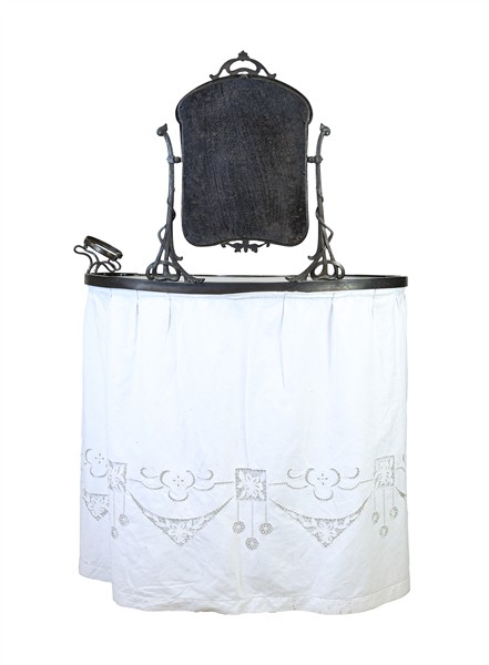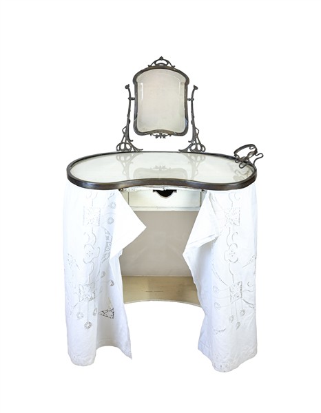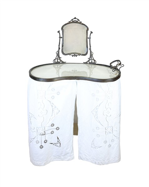 Toelette Liberty con sostegno in legno dipinto bianco, un cassetto sottopiano, bordura del piano, portasapone e specchio basculante in metallo. Inizio secolo XX. Copertura in tessuto bianco ricamato (cm 84x129x50) (difetti e rotture)