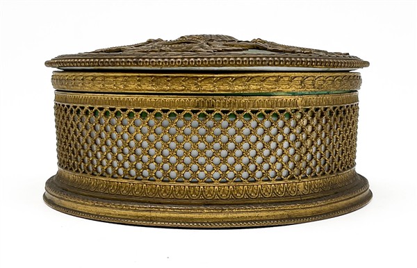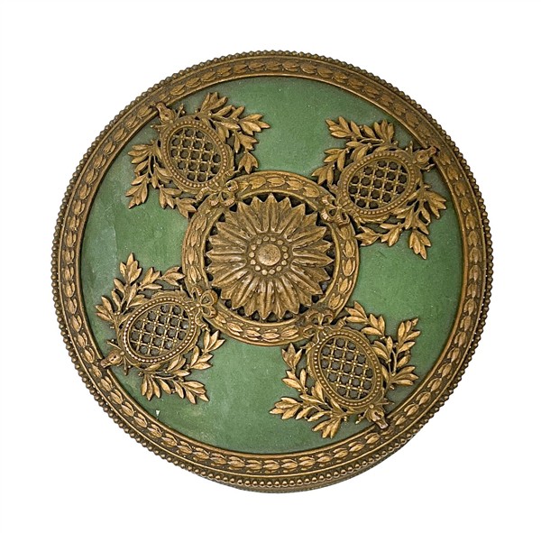 Manifattura di Sèvres, secolo XIX. Scatola con coperchio in porcellana di forma circolare dipinta in monocromia verde con montatura in metallo traforato e dorato. Marcata sotto la base (d cm 11, h cm 5) (difetti e restauri)