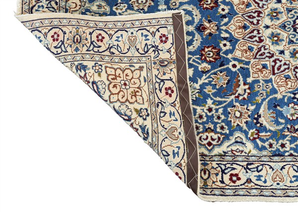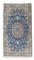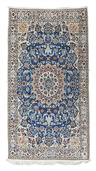 Tappeto Nain, Persia, secolo XX. Annodato in lana e seta. Decoro con medaglione stellare a fondo bianco su campo azzurro cosparso di rami fioriti. Bordura a meandro su fondo bianco (cm 210x113) (difetti e rotture)