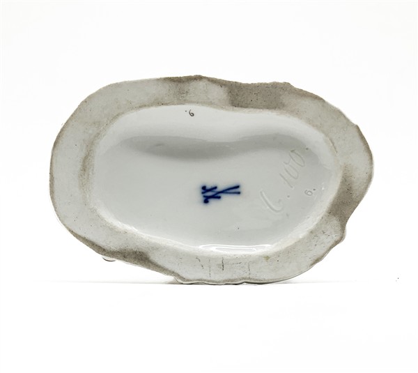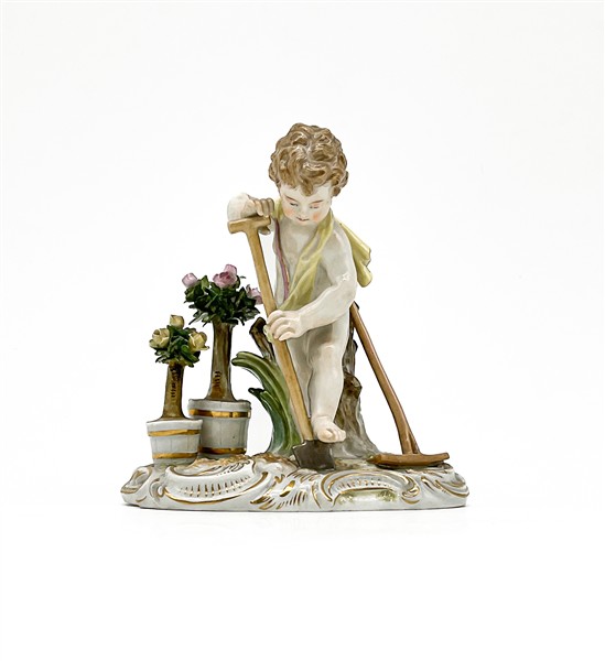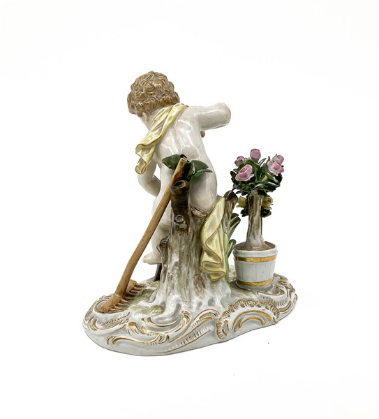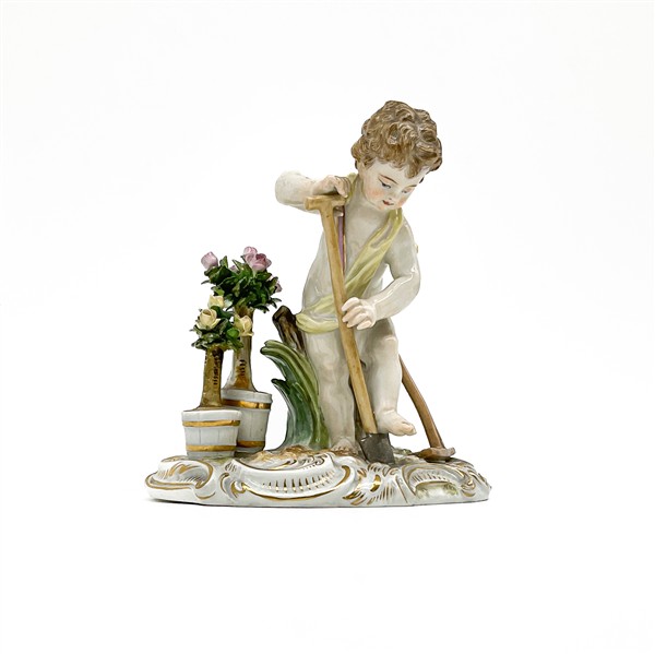 Manifattura di Meissen, secolo XIX. Gruppo in porcellana policroma raffigurante putto giardiniere, profili in oro. Marcato sotto la base (cm 12x11,5x7) (difetti)