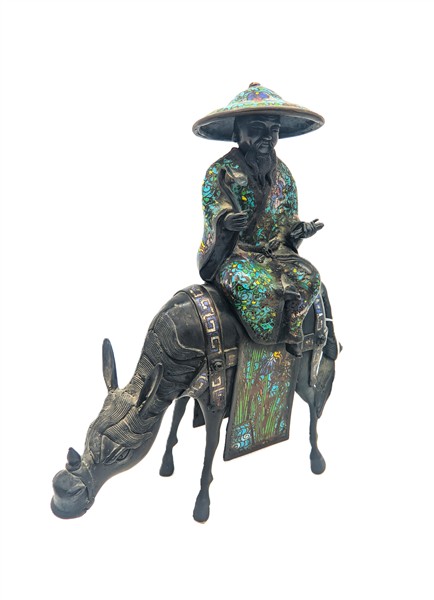Figura di saggio che cavalca un mulo in smalto cloisonné