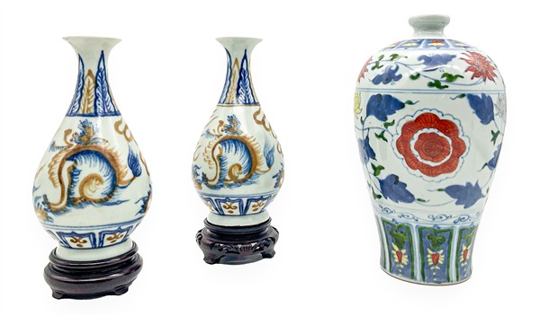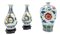 Manifattura di Cina, secolo XX. Lotto di tre vasetti in porcellana policroma di decoro diverso. Due con basi in legno adattate (h max cm 22) (difetti)