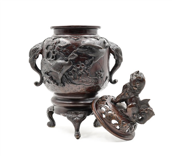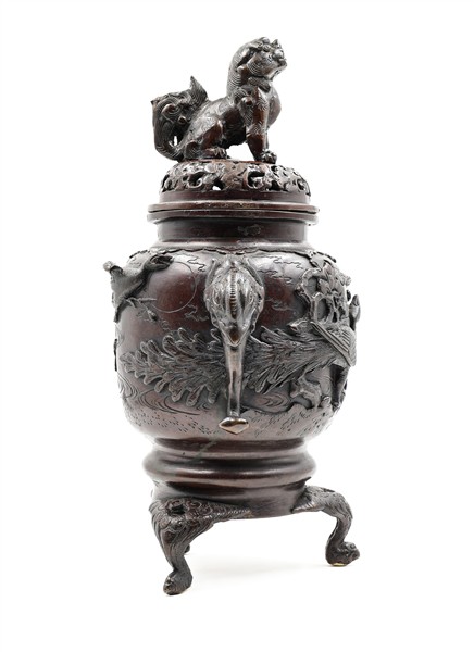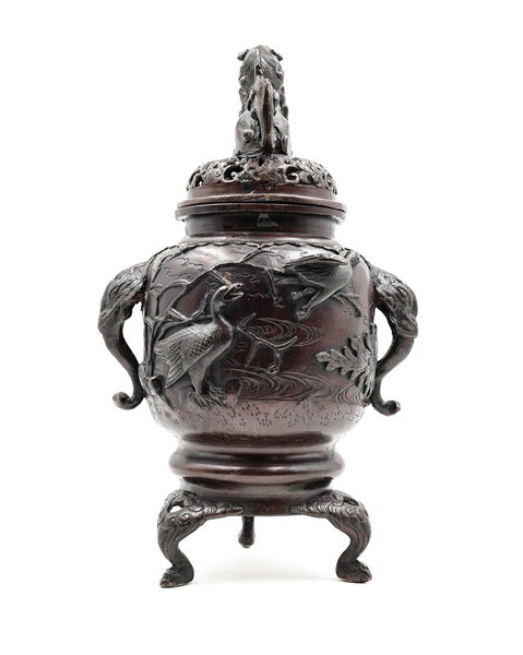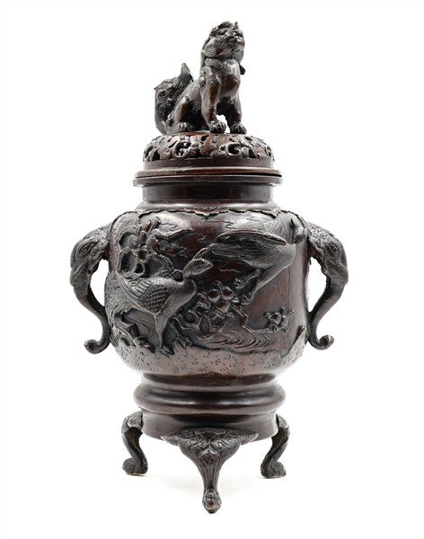 Incensiere in bronzo con decori a rilievo e anse a teste di elefante, cimatura a cane di Pho.