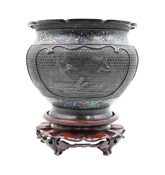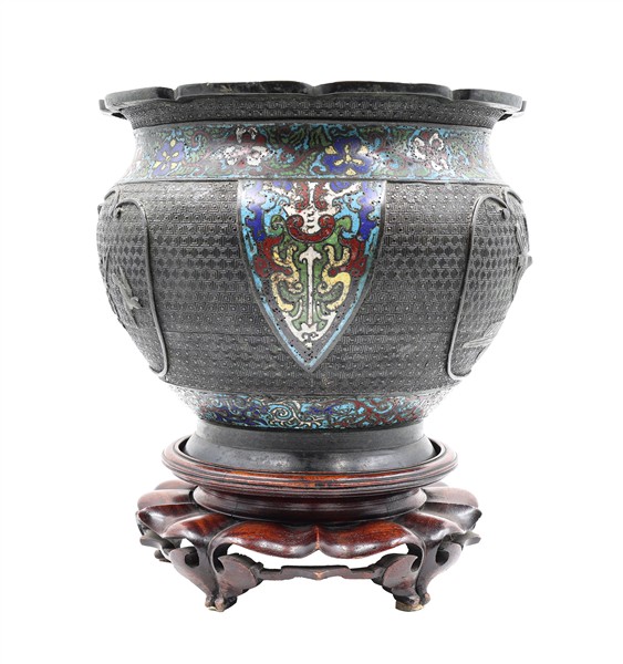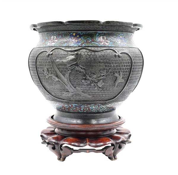 Vaso in bronzo inciso con parti decorate a smalto cloisonné su base in legno