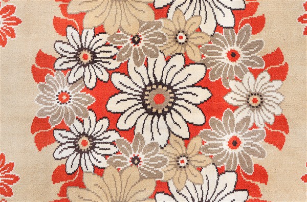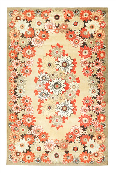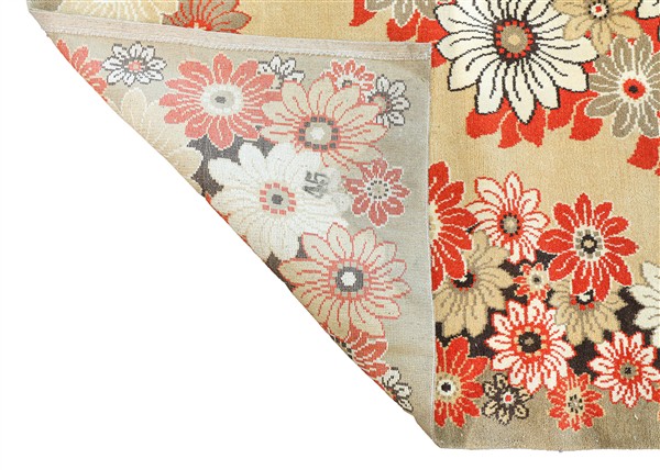 Tappeto meccanico di recente manifattura. Decoro floreale con medaglione su fondo beige (cm 264x181) (difetti)