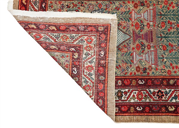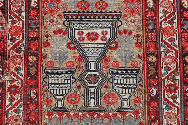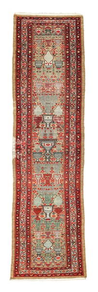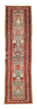 Tappeto passatoia Hamadan, Persia, fine secolo XIX. Decoro con file di architetture ed alberi su fondo cammello (cm 467x92) (difetti e rapature)