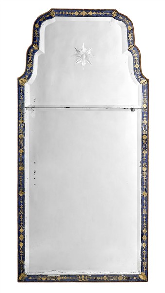 Specchiera di forma mossa in legno dorato, cornice rivestita con lastre in verre églomisé fondo blu con decori vegetali in oro e foglie d'acanto, lo specchio inciso in alto da motivo stellare. Inghilterra, secolo XVIII (cm 128x61,5) (difetti)