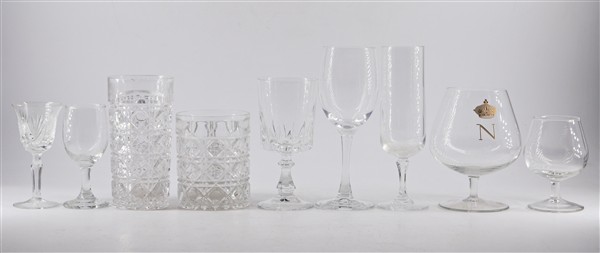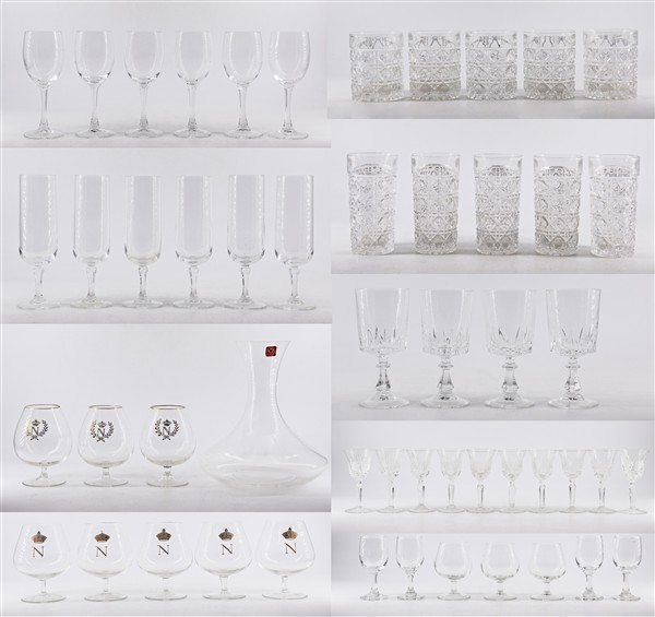 Lotto composto da un decanter, otto balloon e numerosi calici e bicchieri in ve