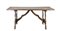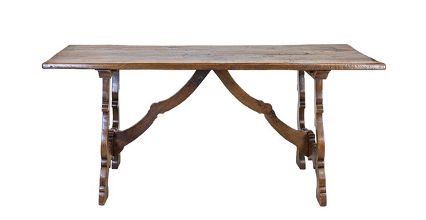 Tavolo fratino con piano rettangolare, gambe sagomate a lira con traverse di ra