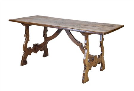 Tavolo fratino con piano rettangolare, gambe sagomate a lira con traverse di raccordo (cm 178x79x80) (difetti)