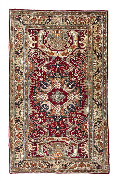 Tappeto Caucaso, recente manifattura. Decoro Kasim Ushag con medaglione su fondo rubino (cm 176x116) (difetti)