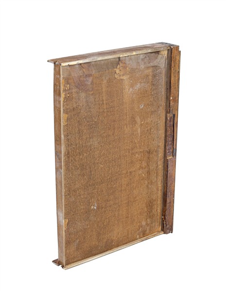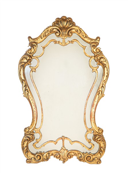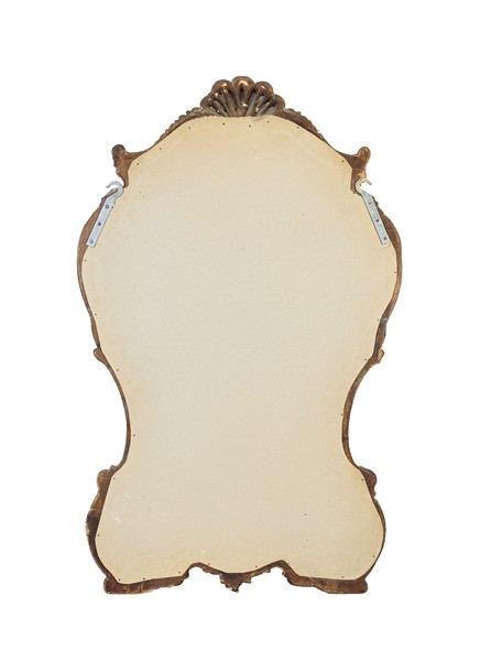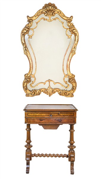 Lotto composto da un tavolino da lavoro in legni vari con piano ribaltabile e cassetto sul fronte, gambe tornite e traversa a tortiglione, secolo XIX (cm 57x69x42) e una specchiera con cornice in legno dorato (cm 107x66) (difetti)