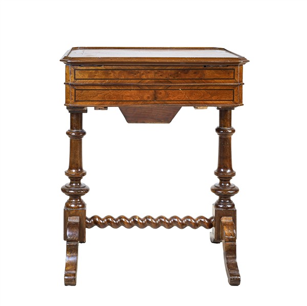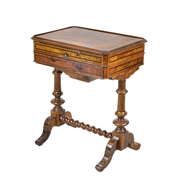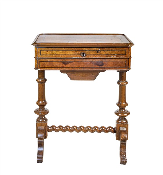 Lotto composto da un tavolino da lavoro in legni vari con piano ribaltabile e c