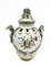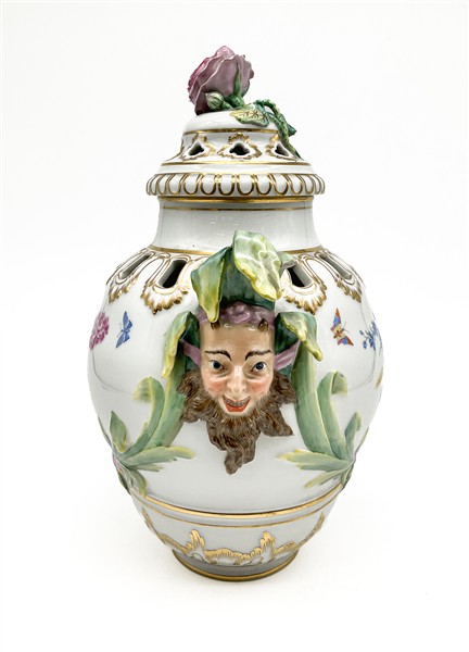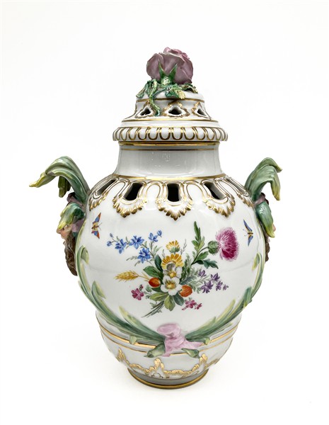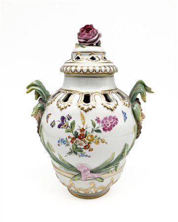 Manifattura di Berlino, secolo XIX. Vaso brucia profumi con coperchio in porcellana traforata e dipinta in policromia a fiori e insetti, anse a mascherone con foglie, presa a rametto con rosa (h cm 29) (difetti)