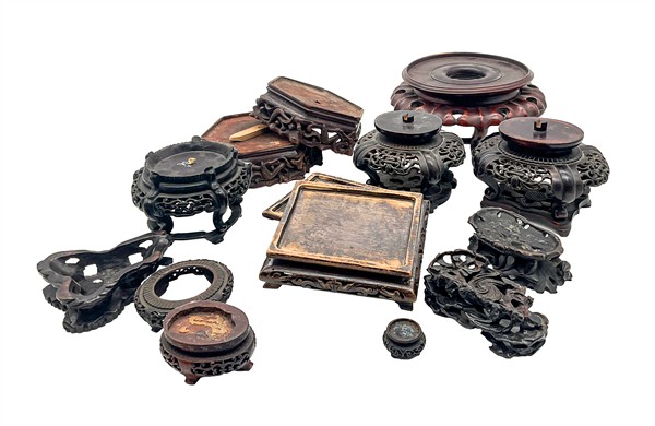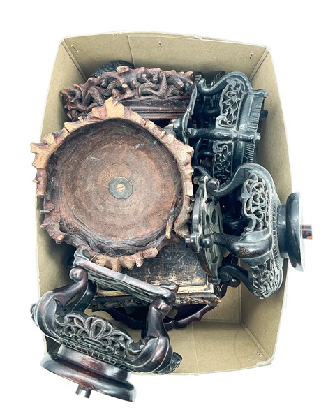 Cartone contenente numerose basi orientali in legno intagliato di varie forme e misure (difetti)
