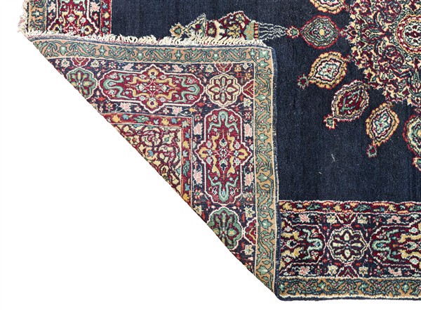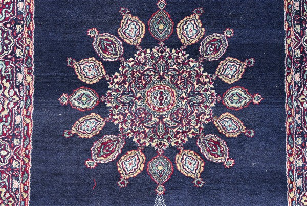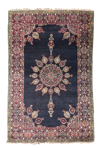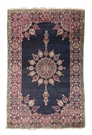 Tappeto Shrinagar, India, secolo XX. Decoro Ardebil su fondo blu notte. Bordura a cartigli su fondo rubino (cm 180x122)