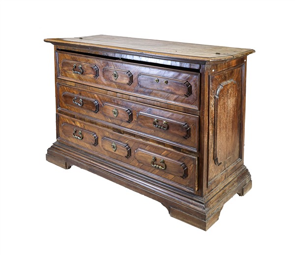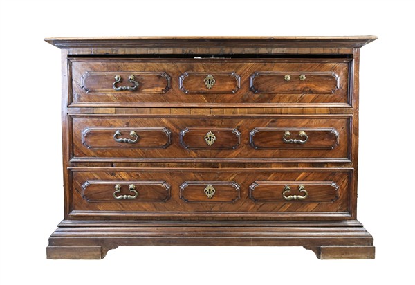Canterano in noce e radica con fronte a tre cassetti di cui uno sottopiano riba