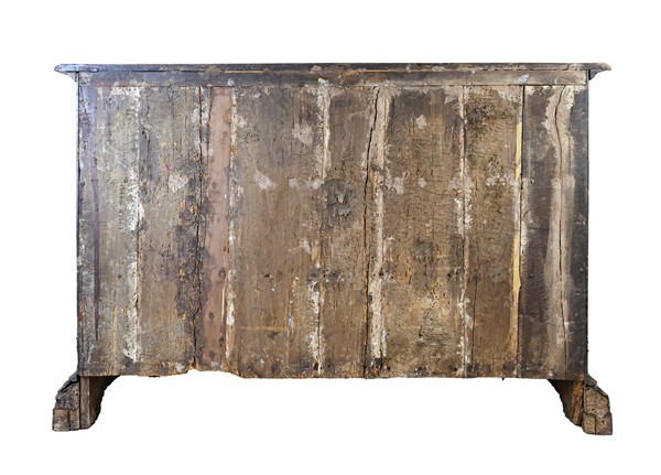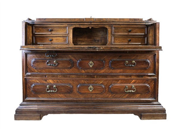 Canterano in noce e radica con fronte a tre cassetti di cui uno sottopiano ribaltabile che rivela quattro tiretti e vano a giorno, piano in parte ribaltabile e piedi a mensola. Secolo XVIII (cm 170x109x66) (difetti, restauri, chiavi mancanti)