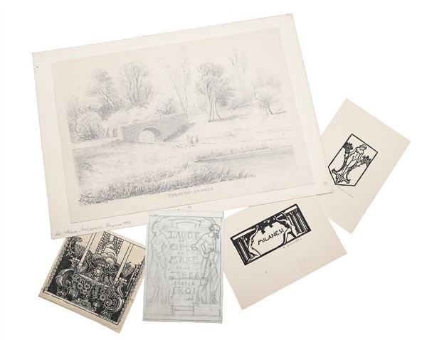 Lotto composto da un disegno firmato Lina Malessevich Royanna, 1886 raffigurante Corneno - Brianza (cm 25x38), unito a tre ex libris di Disertori e un disegno di ex libris Decò di misure diverse (difetti)