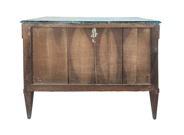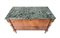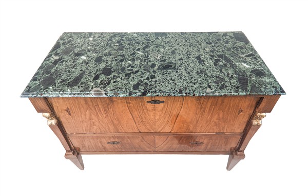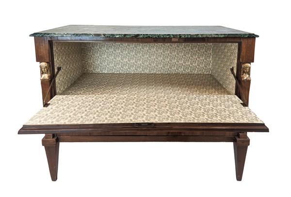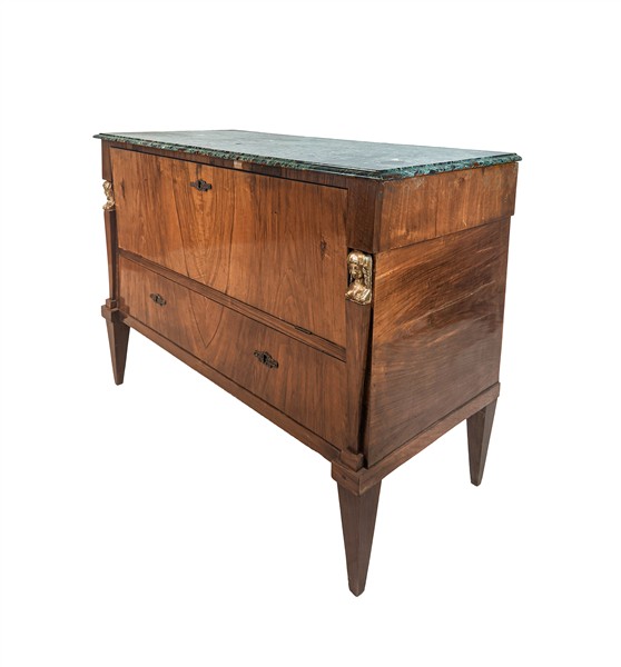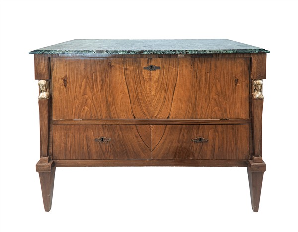 Cassettone lastronato con fronte a due cassetti e ribalta, lesene con erme in legno dorato, gambe rastremare e piano in marmo verde alpi (cm 123x89x58) (difetti, modifiche e sostituzioni)