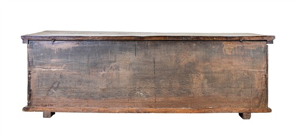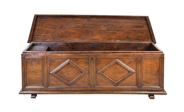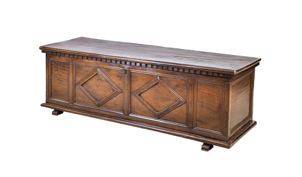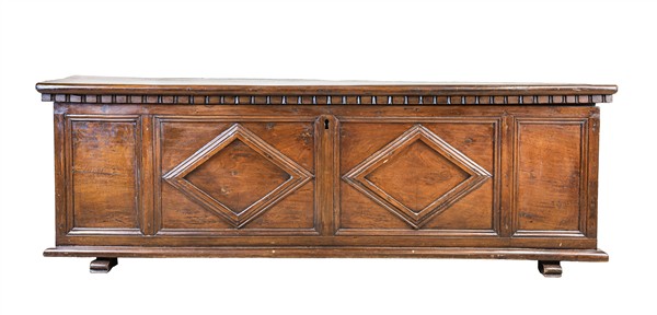 Cassapanca in noce con fronte decorato da losanghe, bordo dentellato (cm 157x52x53) (difetti e restauri)