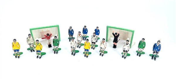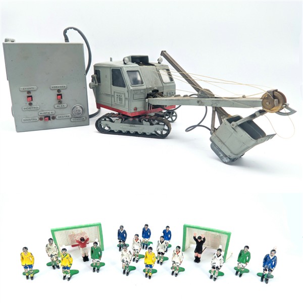Lotto di giochi composto da una escavatrice in metallo e plastica con alimentazione a batteria e telecomando, marcata Mercury ed una scatola contenente calciatori e portieri in plastica e metallo verniciato relativi al gioco da tavolo Tipp-Kick, produzione Mieg Sport Spiel, anni '70 (difetti e mancanze)