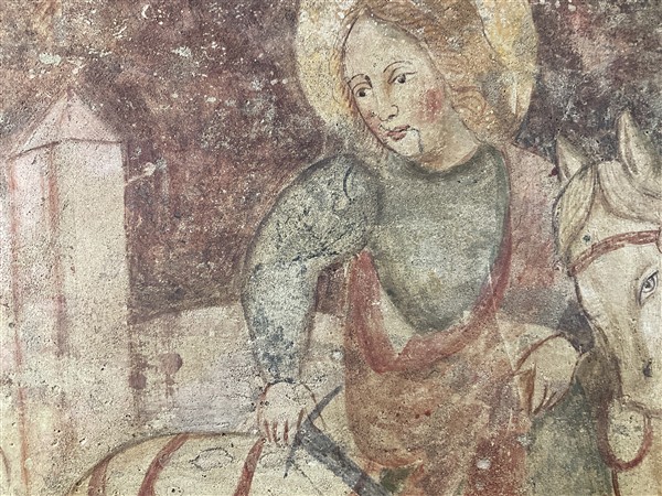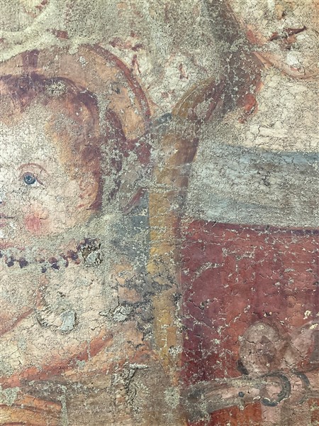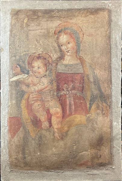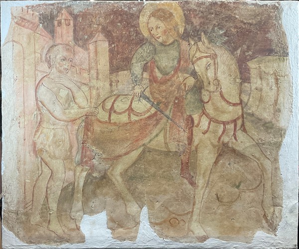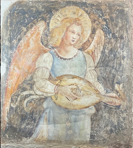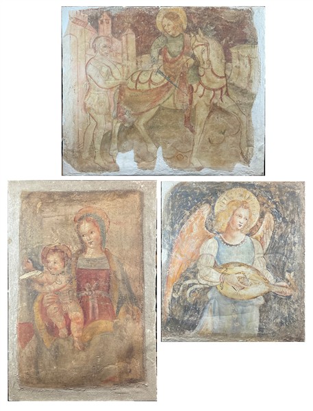 Tre composizioni a finto affresco su tela raffiguranti San Martino che dona il mantello (cm 95x113), Madonna con Bambino (cm 110x74) e Angelo musicante (difetti)