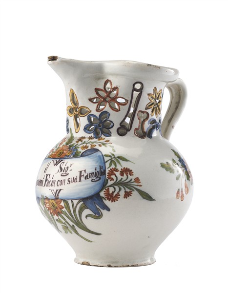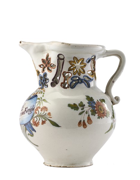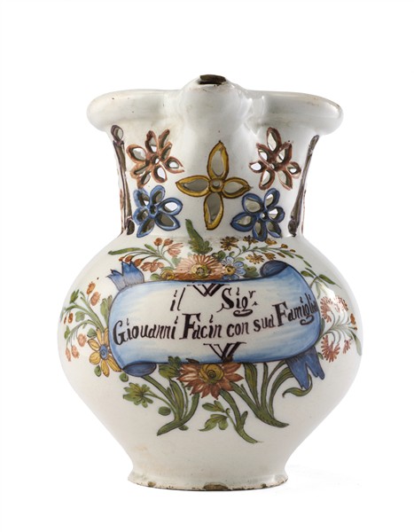Manifattura Antonibon, periodo Baccin (1774-1802), Nove di Bassano. Brocca detta "Bossa buffona" in maiolica policroma ad un'ansa, fascia traforata a fiori stilizzati, decoro floreale e corpo centrato da cartiglio con iscrizione "W il signor Giovanni Facin con sua Famiglia W" (h cm 19) (difetti)