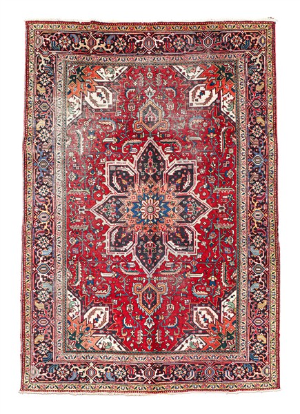 Tappeto Heritz, Persia, secolo XX. Decoro con medaglione polilobato con puntali su campo color rosso cosparso di rami fioriti. Angolari a fondo bianco e bordura con motivo Herati su fondo blu notte (cm 298x237) (difetti)