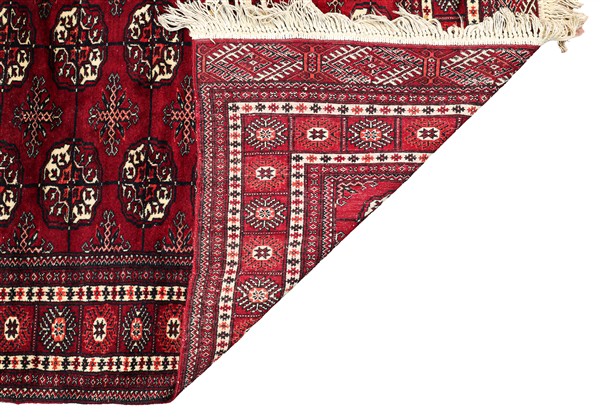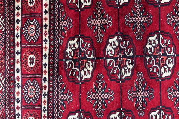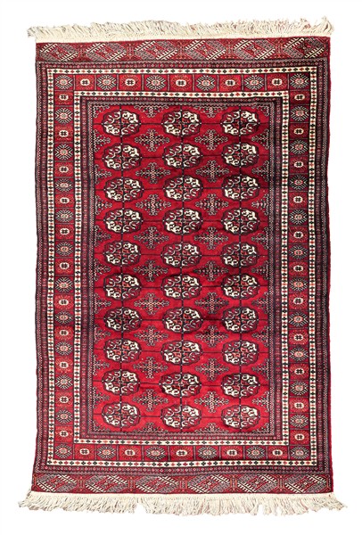 Tappeto Pakistan, secolo XX. Decoro con tre file di Gul su campo rosso (cm 188x126) (difetti)