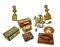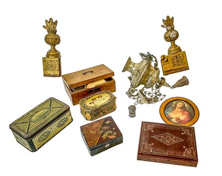 Due cartoni contenenti numerosi oggetti per usi differenti fra cui scatole in latta, fregi e un lampada votiva (difetti)