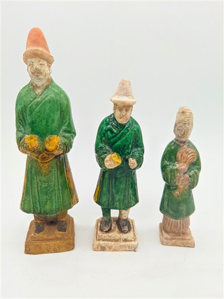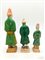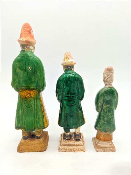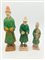 Tre figure di attendenti in terracotta invetriata su base squadrata. Cina, dina