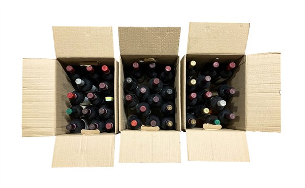 Lotto composto da oltre 20 bottiglie di vino in tre cartoni, tra le quali Pomin