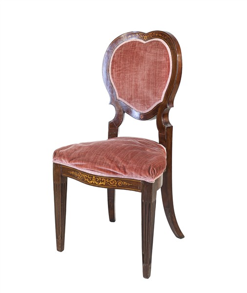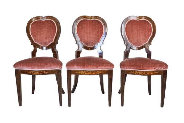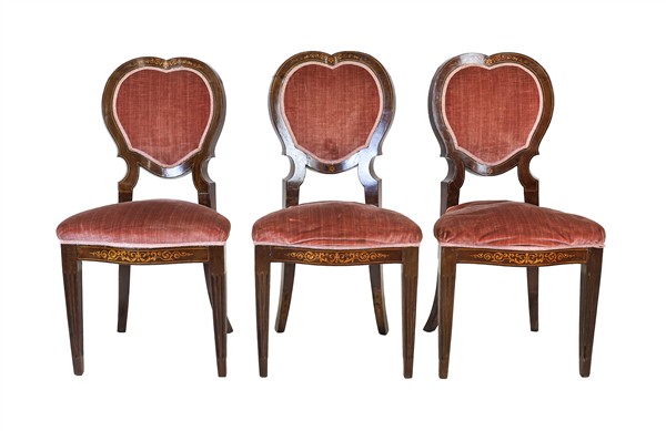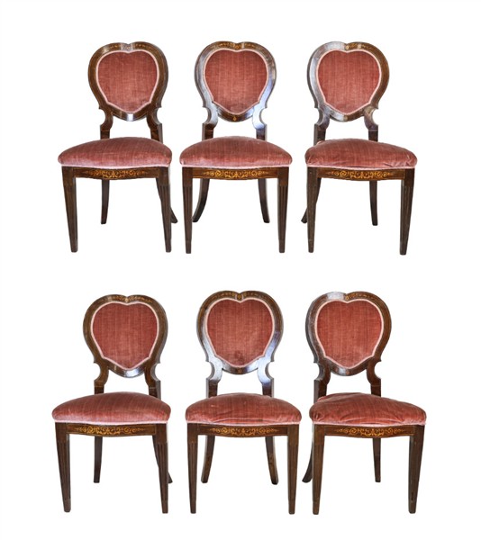 Gruppo di sei sedie in mogano con schienale sagomato, filettato e intarsiato in legno chiaro con decoro fitomorfo, gambe anteriori scanalate e posteriori a sciabola (difetti)
