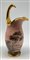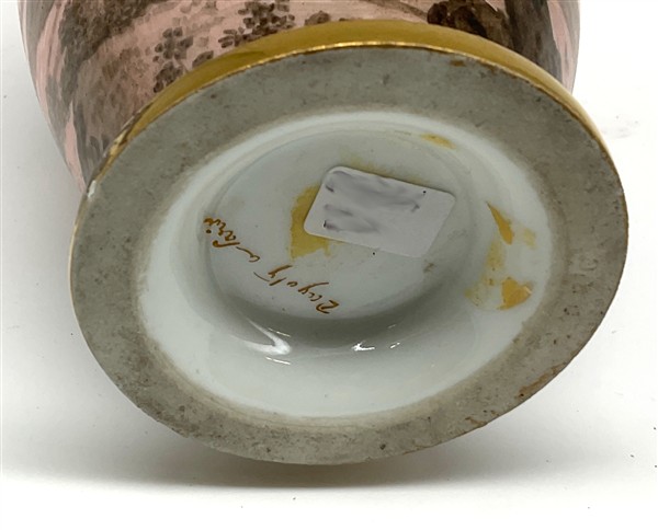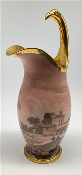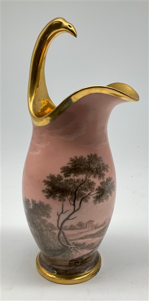 Manifattura Dagoty, secolo XIX. Versatoio in porcellana dipinta in monocromo a paesaggio animato continuo su fondo rosa, ansa a testa di rapace e bordure in oro. Marca "Dagoty à Paris" in oro sul fondo (h cm 22) (lievi difetti)