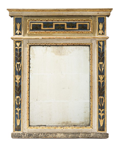 Caminiera in legno intagliato, dipinto e dorato con lesene e fregio a motivi fitomorfi, specchio rettangolare. Secolo XIX (cm 93x76) (difetti e mancanze)