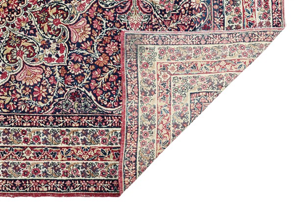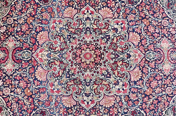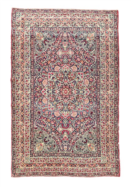 Tappeto Kirman, Persia, secolo XX. Decorato da motivi floreali policromi su campo color ciclamino (cm 202x137) (difetti e rapature)