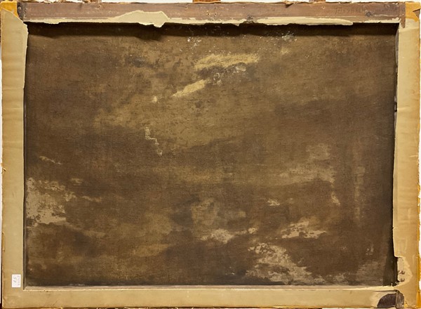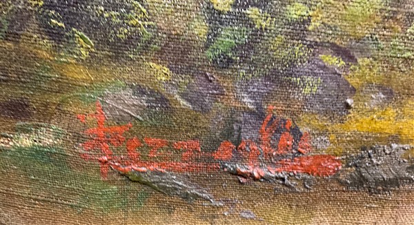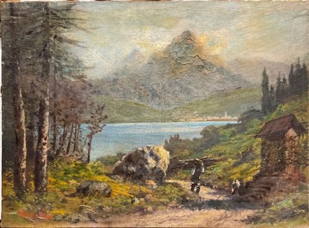 Firma indecifrata, "Paesaggio lacustre", olio su tela (cm 63x85) firmato in basso a sinistra, in cornice (difetti)