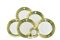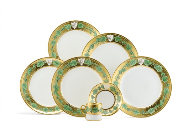 Manifattura di Parigi, 1820 circa. Cinque piatti ed una tazzina con piattino in porcellana decorata nella tesa a tralcio d'edera e bacche in verde su fondo oro, bordure centrate da scudo con monogramma "CC" in oro (piatto d cm 24; tazzina h cm 6; piattino d cm 13) (difetti)