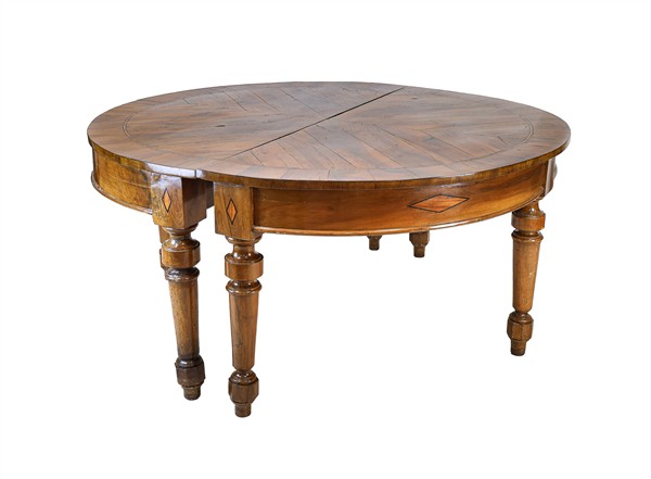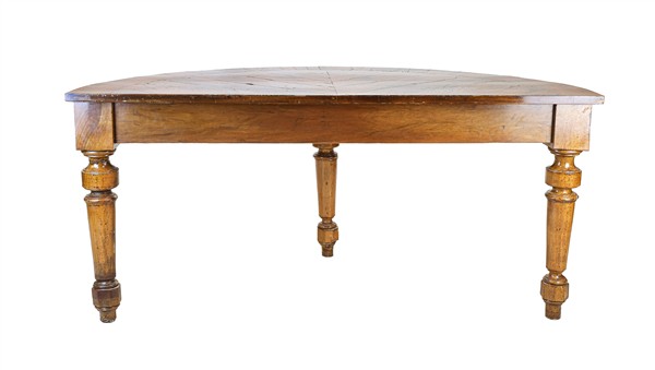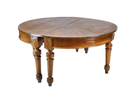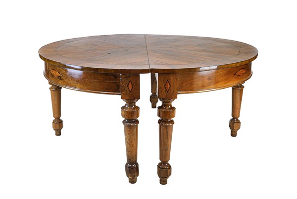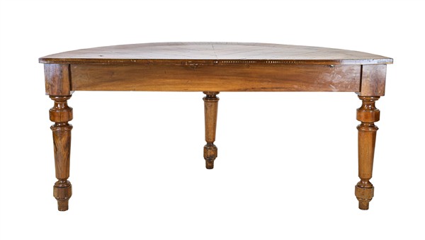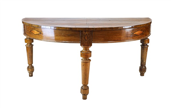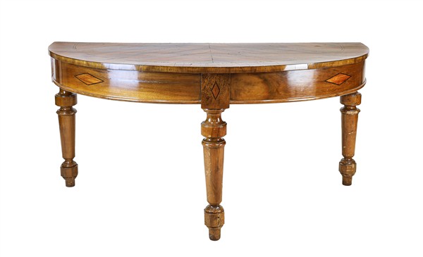 Coppia di mezzi tavoli in noce con gambe tornite e piani lastronati in radica e filettati. Secolo XIX (cm 170x79x89 cad.) (difetti)