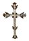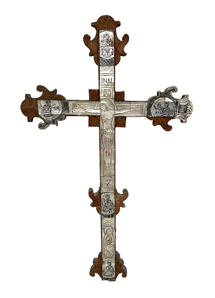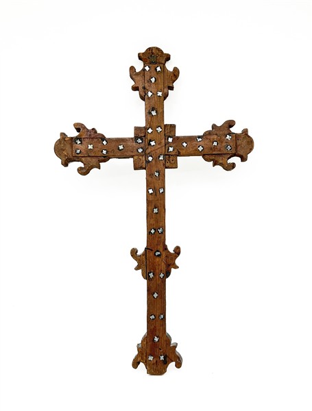 Crocifisso in legno sagomato e decorato da placche in madreperla incisa. Terra