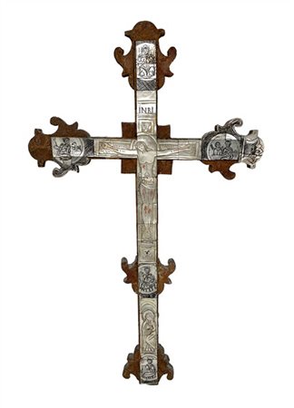 Crocifisso in legno sagomato e decorato da placche in madreperla incisa. Terra Santa, inizio secolo XX (cm 52x32) (difetti e mancanze)
