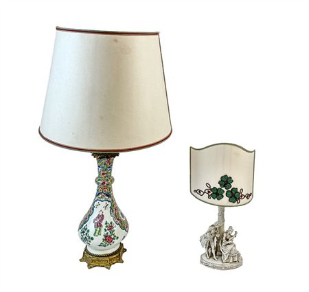 Lotto composto da due lampade d'appoggio, una con sostegno a vaso orientale in porcellana policroma con base in metallo dorato e una con sostegno in porcellana bianca a forma di gruppo galante, dotate di paralume (h tot cm 73 e 40) (difetti)