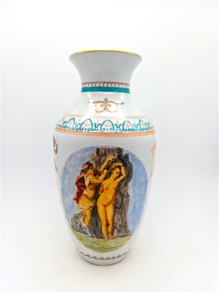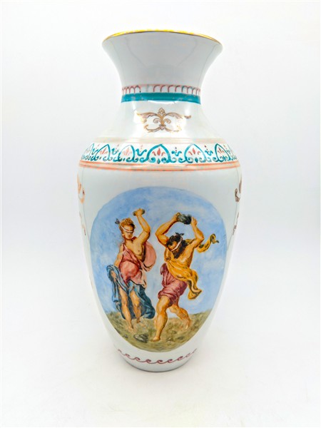 Manifattura Ancap, Verona, secolo XX. Vaso in porcellana dipinta in policromia a figure mitologiche e profili in oro (h cm 42) (lievi difetti)