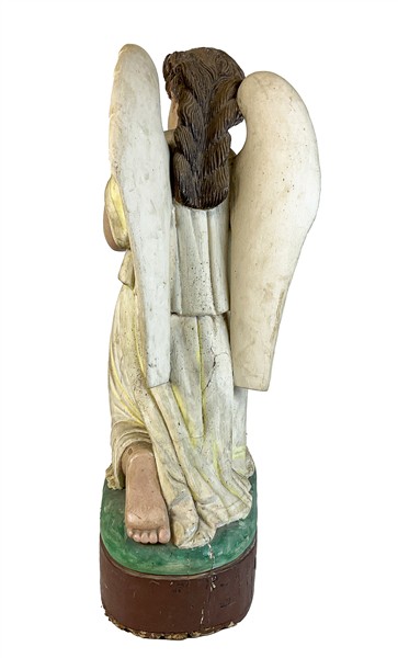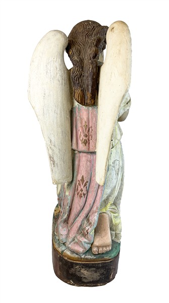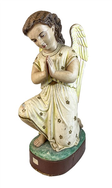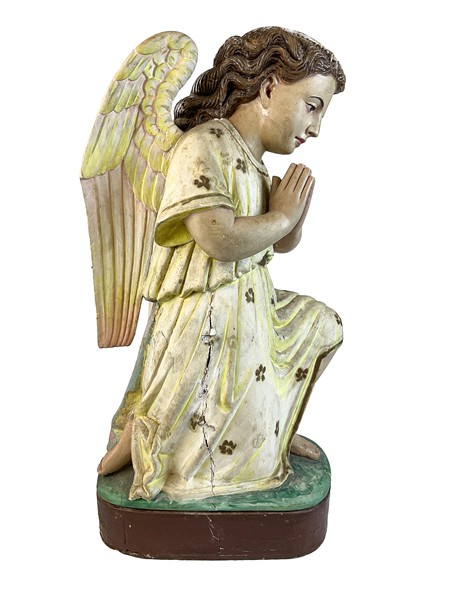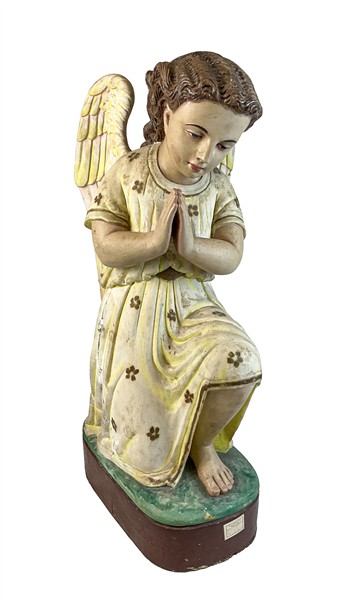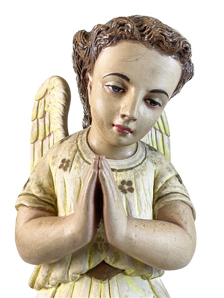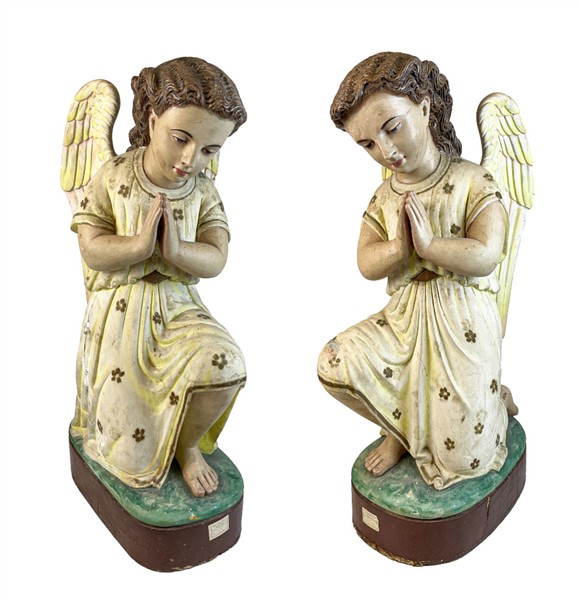 Coppia di angeli in preghiera in legno intagliato e stucco dipinto in policromi