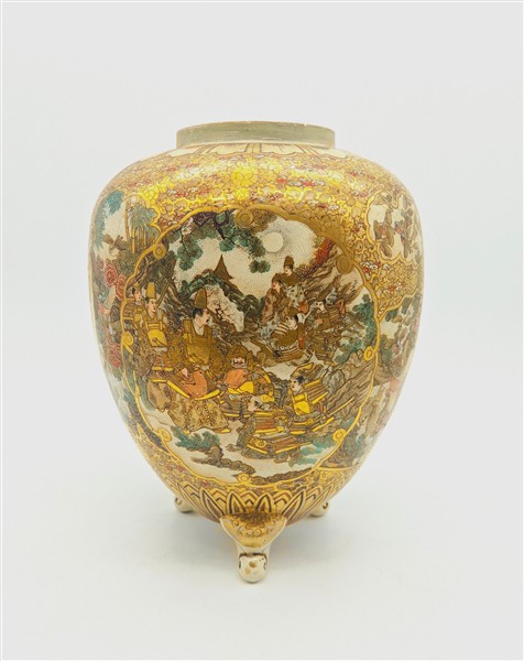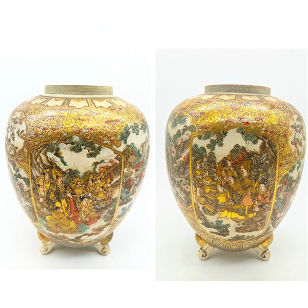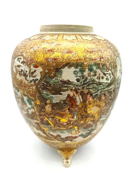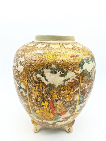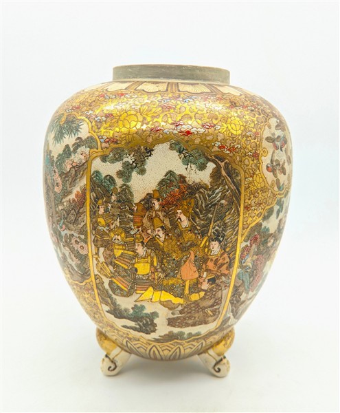 Coppia di potiche in porcellana Satsuma decorate da figure in armatura tra paes