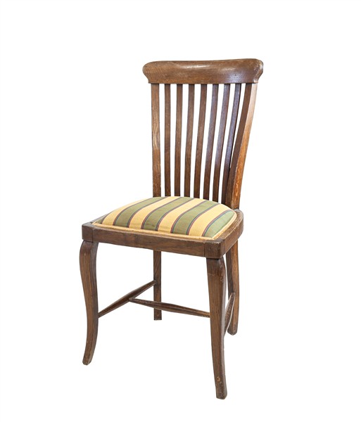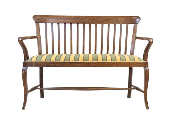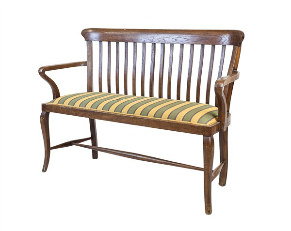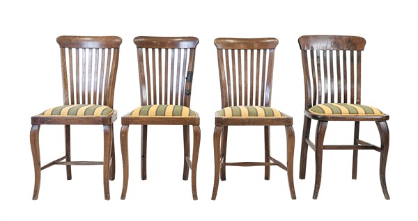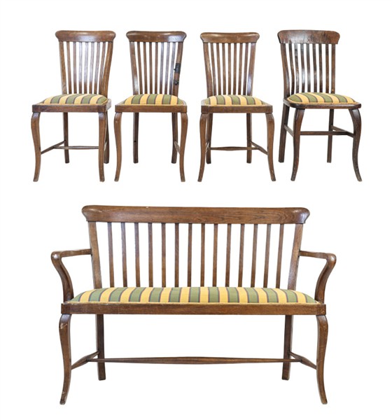 Lotto composto da quattro sedie e un divanetto a tre posti in rovere con schienale a listelli e gambe raccordate da traverse (difetti)